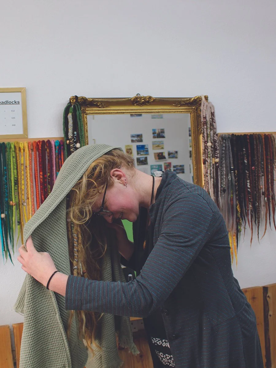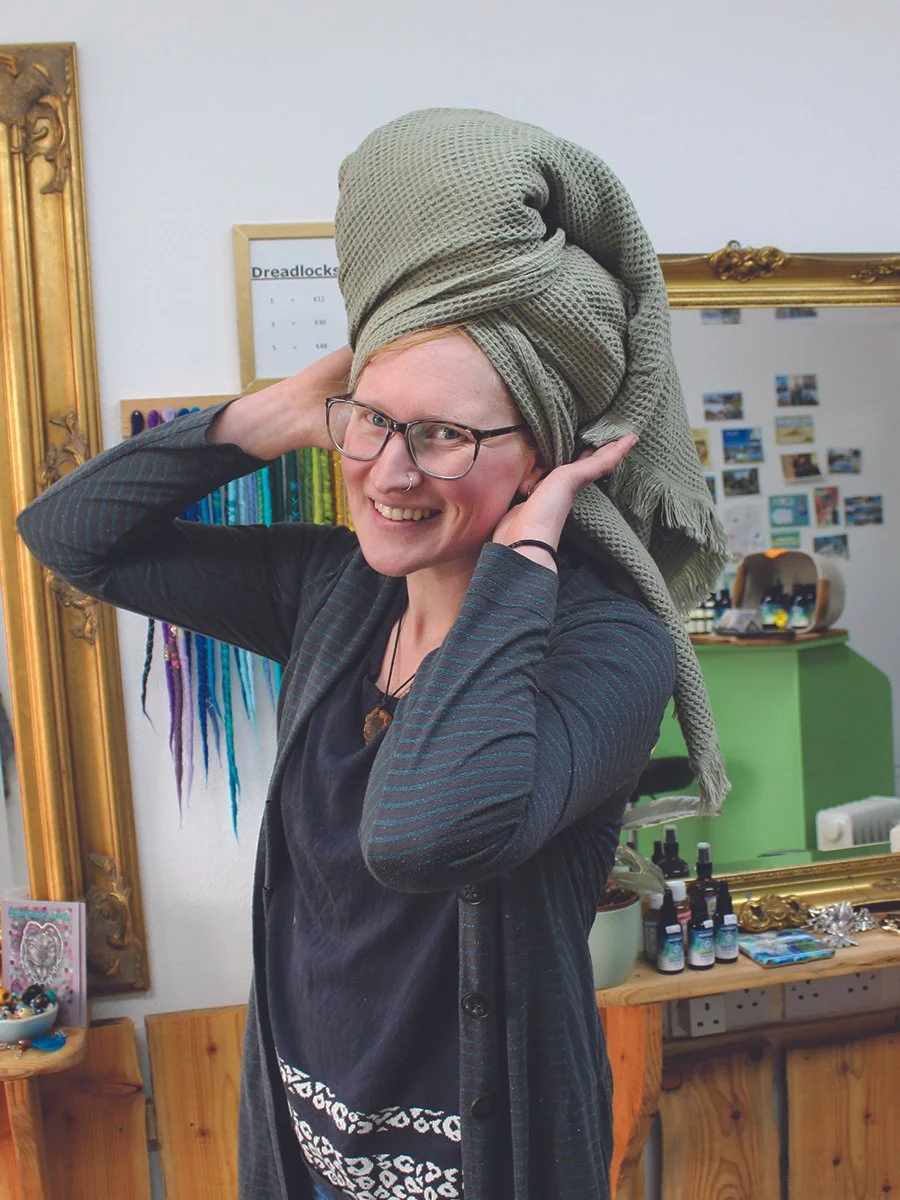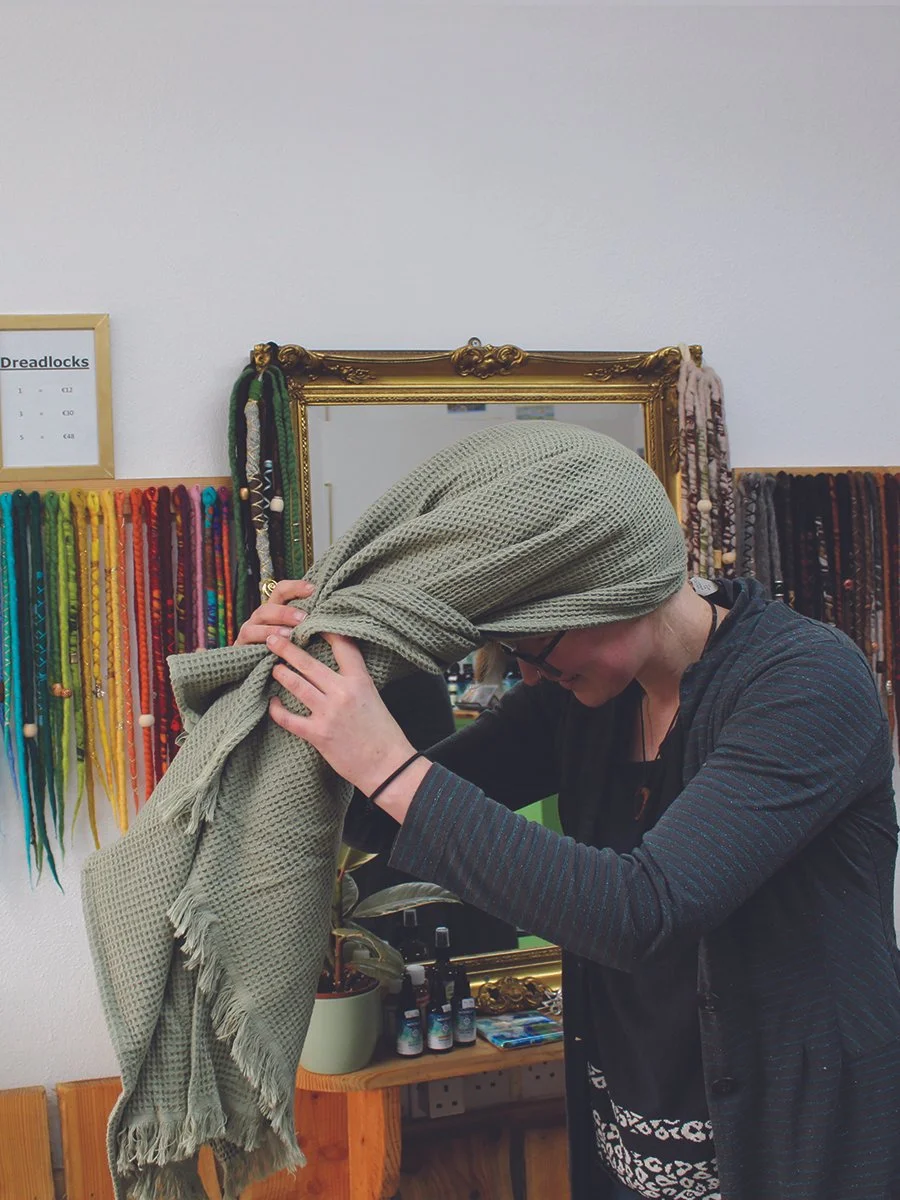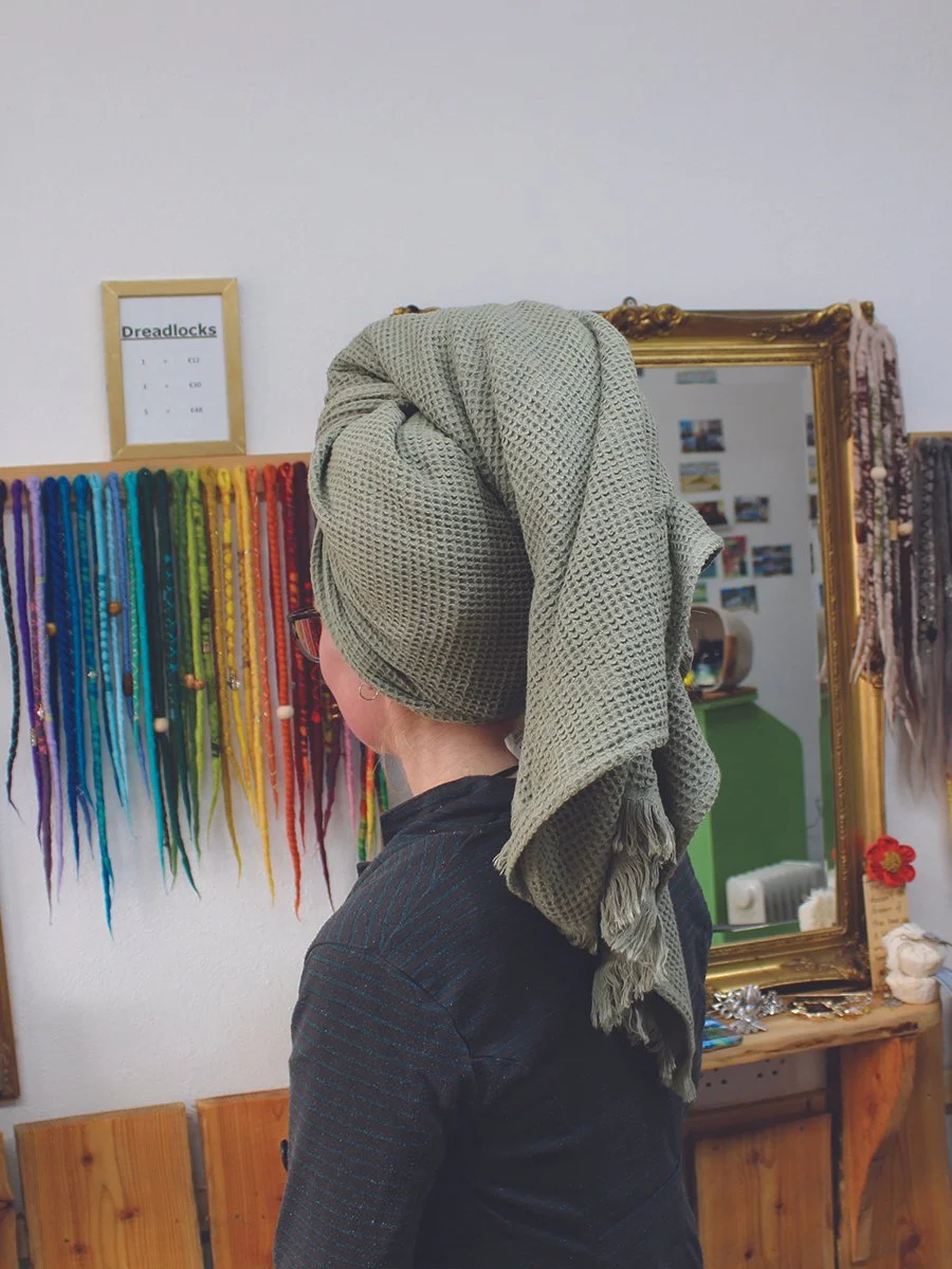 After many years of trying we find 100% cotton waffle towels the most absorbent and efficient in drying your dreadlocks.